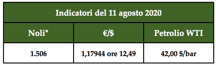 l’Indice dei noli è salito a 1.506 punti, il petrolio sfiora i 42,00 $/bar e l’indice di cambio €/$ segna 1,17944 ore 12,49.