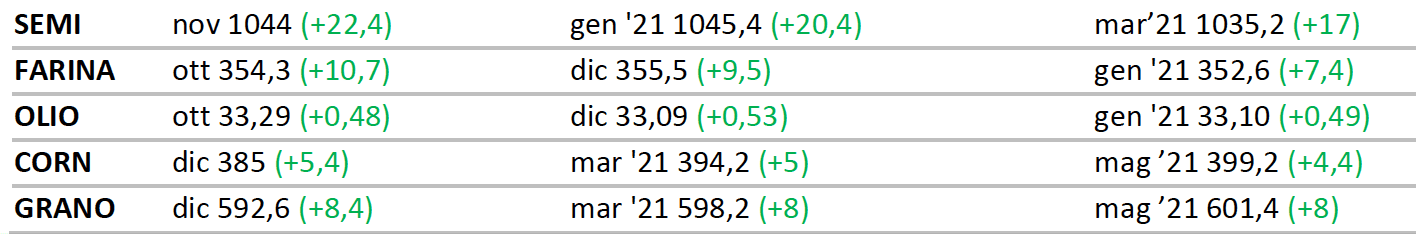 Consigliabile perciò mantenere i nervi saldi sui proteici e sui cereali e di muoversi in un minimo di copertura sino a marzo, più per motivi di logistica e Covid, che di mercato (visto che il virus ricomincia a galoppare) e se si vogliono fare coperture meglio operare solo dal secondo semestre 2021 o comunque dopo il primo trimestre dello stesso anno.