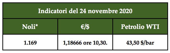 l’Indice dei noli B.D.Y. è leggermente sceso a 1.1169 punti, il petrolio sfiora i 43,50 $/bar e l’indice di cambio €/$ segna 1,18508 ore 8,55.