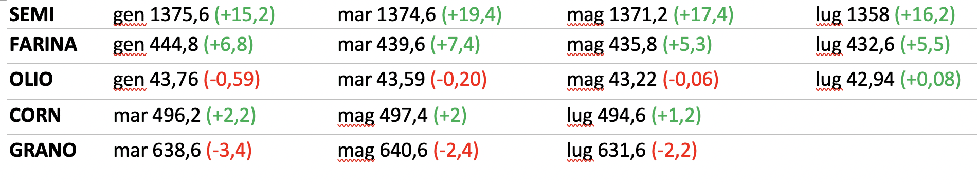 Mario Boggini – esperto di mercati cerealicoli nazionali e internazionali – (per contatti +39 338 6067872) – Valori indicativi senza impegno, soggetti a variazioni improvvise. Questa informativa non costituisce servizio di consulenza finanziaria ed espone soltanto indicazioni-informazioni per aiutare le scelte del lettore, pertanto qualsiasi conseguenza sull’operatività basata su queste informative ricadono sul lettore.