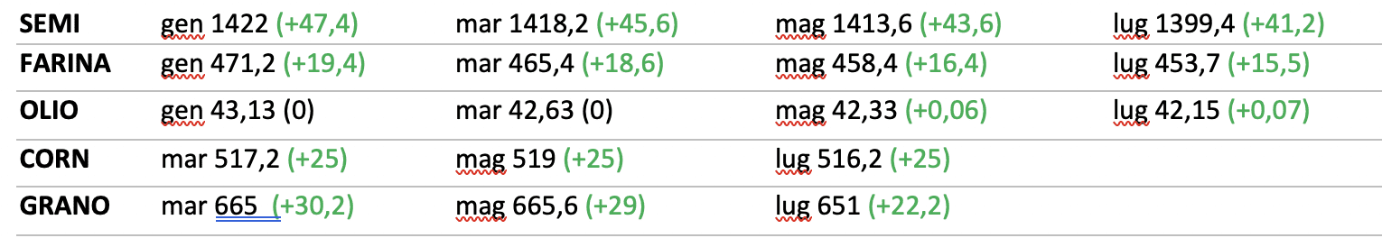 Mario Boggini – esperto di mercati cerealicoli nazionali e internazionali – (per contatti +39 338 6067872) – Valori indicativi senza impegno, soggetti a variazioni improvvise. Questa informativa non costituisce servizio di consulenza finanziaria ed espone soltanto indicazioni-informazioni per aiutare le scelte del lettore, pertanto qualsiasi conseguenza sull’operatività basata su queste informative ricadono sul lettore.