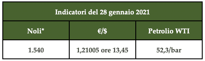 l’Indice dei noli B.D.Y. è sceso a 1.540 punti, il petrolio sfiora i 52,3 $/bar e l’indice di cambio €/$ segna 1,21005 ore 13,45