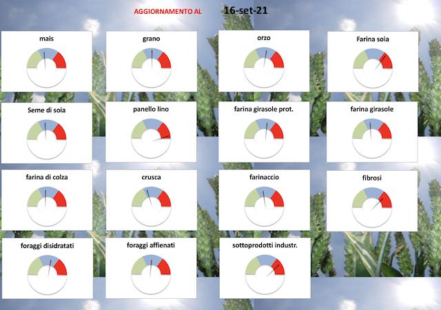 Farine di soye; Seme di girasole; Farina di girasole basso proteico e forse anche di proteico a breve; Buccette di Soya; Seme di Lino; Panello di Lino; Polpe Bietola; Orzo nazionale; mi dicono Fieni; Mais Estero, e qui nasce il problema Bomba del più 2€ di Treviso e più 5€ di Bologna che probabilmente potrebbe continuare sino a metà ottobre.