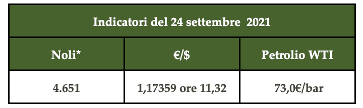 L’indice dei noli B.D.Y è sceso a 4.651 punti, (premi/noli in aumento) il petrolio wti gira a circa 73 dollari al barile, e il cambio gira a 1,17359 ore 11,32