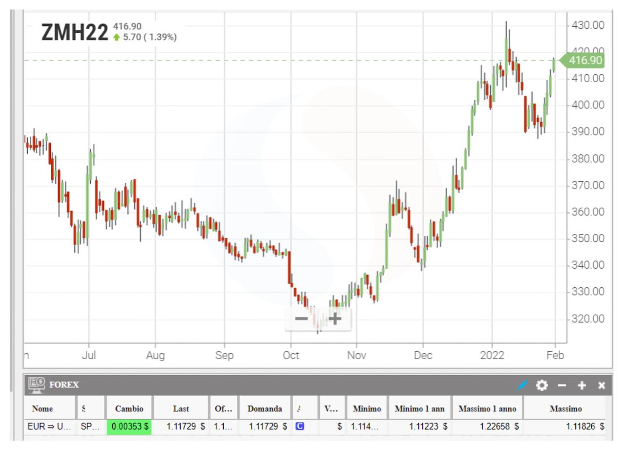 Il momento attuale da non facile, si sta evolvendo a drammatico, prezzi alti e scarsità di vari prodotti. Il commento, se vi restano delle parole, lo si può completare osservando il grafico della farina di soya qui sotto: dai minimi della seconda decade di novembre si è giunti a quasi 100 punti base in più!