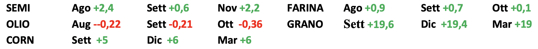 Le variazioni sulla seduta precedente in centesimi di dollaro per Bushel per semi, corn e grano, in dollari per tonnellata corta per la farina