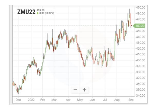 Come già riportato in precedenza, il mercato si muove ad onde, specie per il comparto soya, il grafico sottostante riguarda la farina per il mese di settembre dall’inizio dell’anno, i balzi registrati: una punta in febbraio seguita da un picco in maggio un periodo maggio luglio altalenante, poi altri vari picchi in agosto arrivando a circa 485$ per tonnellata corta, per poi ridiscendere agli attuali 459 $.