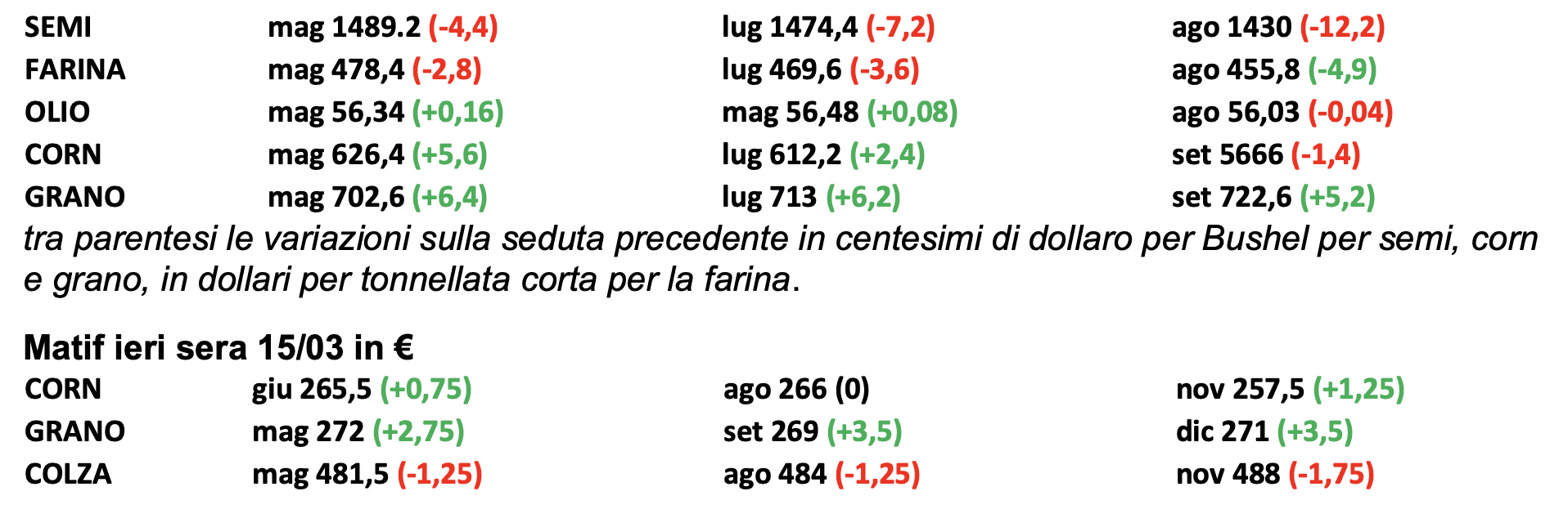 Mario Boggini – esperto di mercati cerealicoli nazionali e internazionali – (per contatti +39 338 6067872) – Valori indicativi senza impegno, soggetti a variazioni improvvise. Questa informativa non costituisce servizio di consulenza finanziaria ed espone soltanto indicazioni-informazioni per aiutare le scelte del lettore, pertanto qualsiasi conseguenza sull’operatività basata su queste informative ricadono sul lettore.