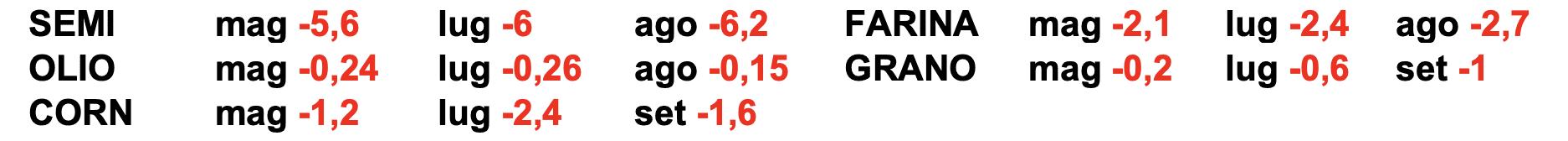Mario Boggini – esperto di mercati cerealicoli nazionali e internazionali – (per contatti +39 338 6067872) – Valori indicativi senza impegno, soggetti a variazioni improvvise. Questa informativa non costituisce servizio di consulenza finanziaria ed espone soltanto indicazioni-informazioni per aiutare le scelte del lettore, pertanto qualsiasi conseguenza sull’operatività basata su queste informative ricadono sul lettore.
