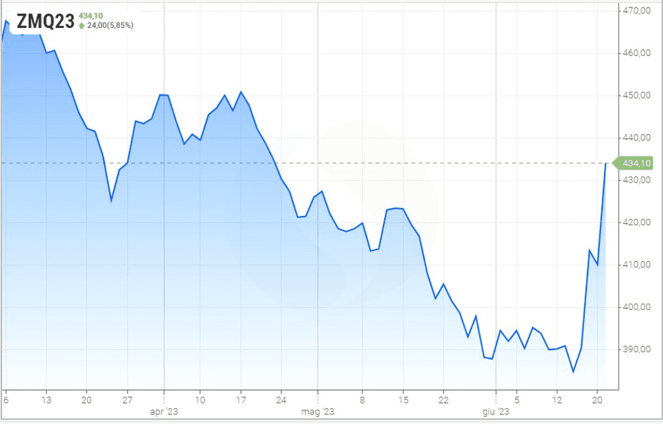 Purtroppo occorre rilevare che il mercato è entrato in una fase di WEATHER MARKET (mercato meteorologico) e così in questo momento è tutto in forte rialzo: la farina di soya è già su luglio a 422$ e su agosto a 419$ (per tonnellata corta e la in USA) Queste le chiusure di ieri sera a Chicago 20/06/2023