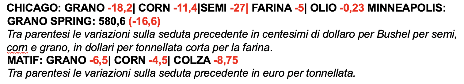 Mario Boggini – esperto di mercati cerealicoli nazionali e internazionali – (per contatti +39 338 6067872) – Valori indicativi senza impegno, soggetti a variazioni improvvise. Questa informativa non costituisce servizio di consulenza finanziaria ed espone soltanto indicazioni-informazioni per aiutare le scelte del lettore, pertanto qualsiasi conseguenza sull’operatività basata su queste informative ricadono sul lettore.