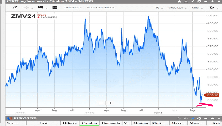 Quello che segue è il grafico della farina di soya dal 2022 ad oggi. Come si può osservare, nel fine della scorsa settimana, il mercato ha toccato valori minimi che non raggiungeva dal 2021, ieri sera a fronte anche dell’indebolimento del cambio euro/dollaro il mercato sta tentando un rimbalzo.