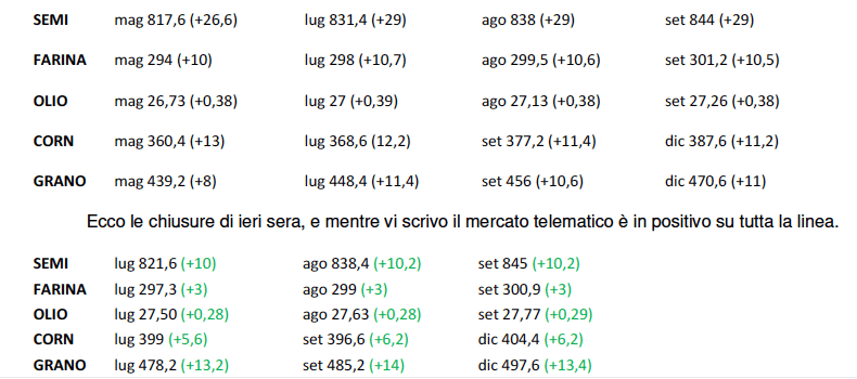 Mario Boggini – esperto di mercati cerealicoli nazionali e internazionali – (per contatti +39 338 6067872) – Valori indicativi senza impegno, soggetti a variazioni improvvise. Questa informativa non costituisce servizio di consulenza finanziaria ed espone soltanto indicazioni-informazioni per aiutare le scelte del lettore, pertanto qualsiasi conseguenza sull’operatività basata su queste informative ricadono sul lettore.