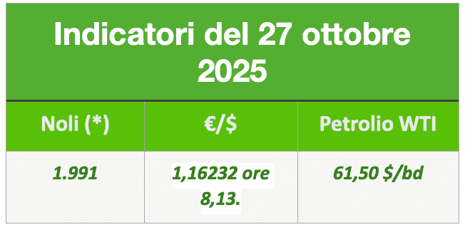 L’indice dei noli b.d.y. è sceso a 1.991 punti, il petrolio wti è salito a circa 61,50 al barile, il cambio €/$ gira a 1,16232 ore 8,13.