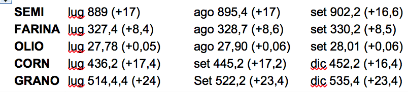 Il mais logicamente è il più colpito e ha chiuso giovedi sera a 436 punti cents di dollaro per bushel, quotazione che non si vedeva dal 2014 e questo ha trascinato tutto il resto: