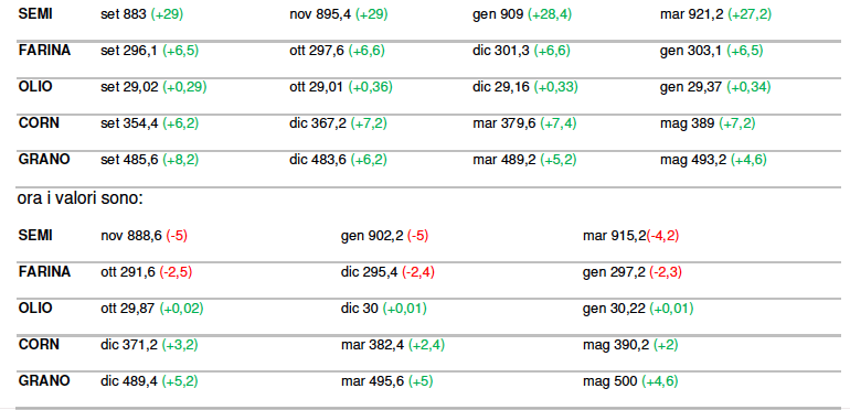 Mario Boggini – esperto di mercati cerealicoli nazionali e internazionali – (per contatti +39 338 6067872) – Valori indicativi senza impegno, soggetti a variazioni improvvise. Questa informativa non costituisce servizio di consulenza finanziaria ed espone soltanto indicazioni-informazioni per aiutare le scelte del lettore, pertanto qualsiasi conseguenza sull’operatività basata su queste informative ricadono sul lettore.