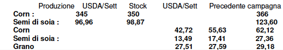L’aspettativa è grande, e nella attesa sono arrivate le previsioni di Bloomberg , le cifre delle previsioni dei raccolti e degli stock USA degli analisti (in milioni di ton.)