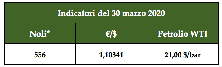 l’Indice dei noli è sceso a 556 punti, il petrolio sfiora i 21 $/bar e l’indice di cambio €/$ segna 1,10341 (Hr. 16,00).