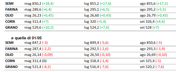 Il telematico nel momento in cui scriviamo: seme maggio -9,50 punti: farina maggio -2,20 dollari per tonnellata corta, mais maggio –5 punti; grano maggio -5,50 punti.